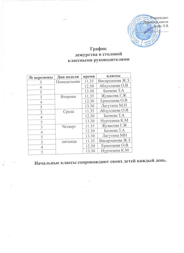 Сынып жетекшілерінің асханадағы кезекшілік кестесі