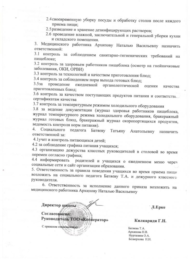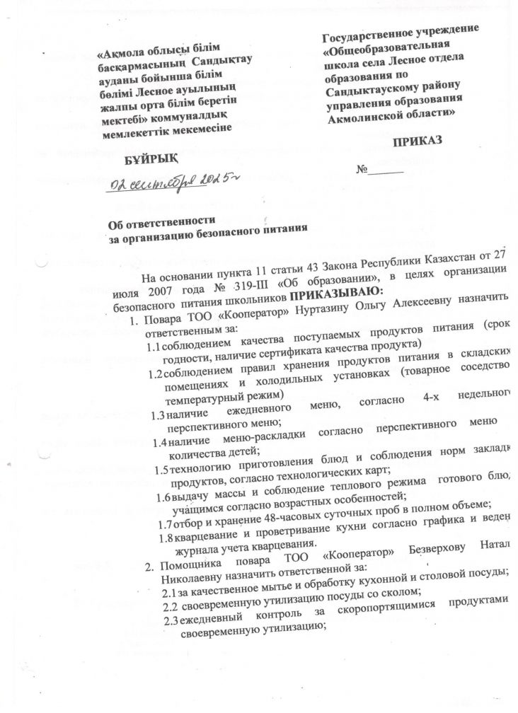 қауіпсіз тамақтануды ұйымдастыруға жауапкершілік туралы бұйрық